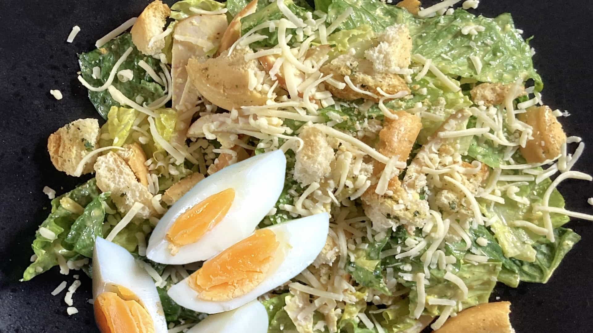 Serveer de salade op een bord en strooi er wat geraspte kaas overheen en leg er de eieren op.