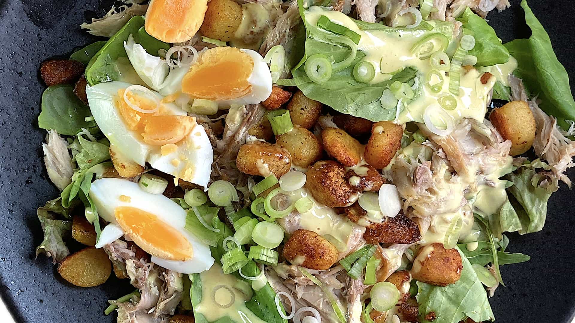 Serveer de salade op een bord en garneer met de eierpartjes.