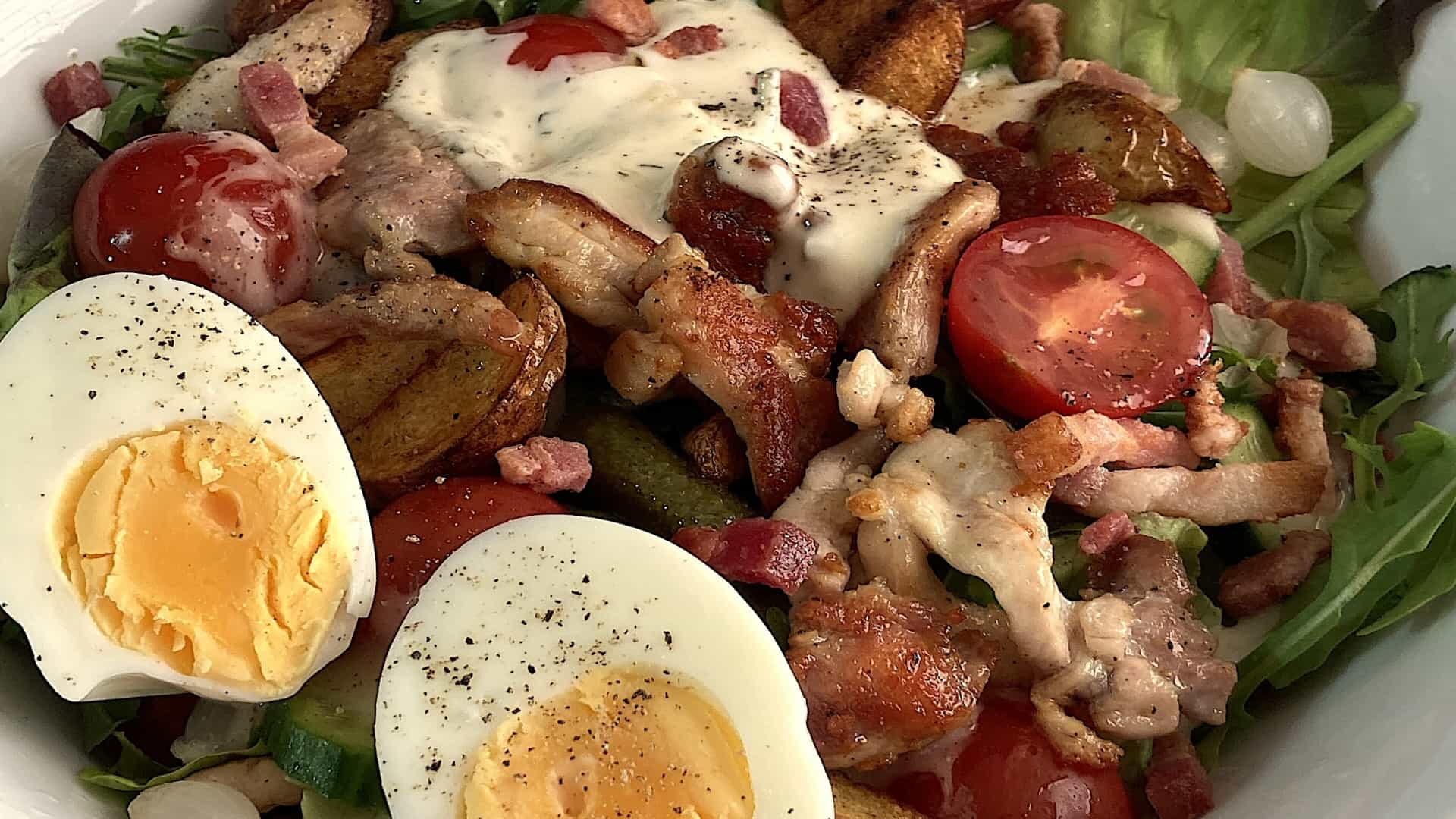 Serveer de maaltijdsalade op een diep bord. Garneer eventueel met de eieren en olijfen. 2 slagen met de pepermolen en smullen maar.