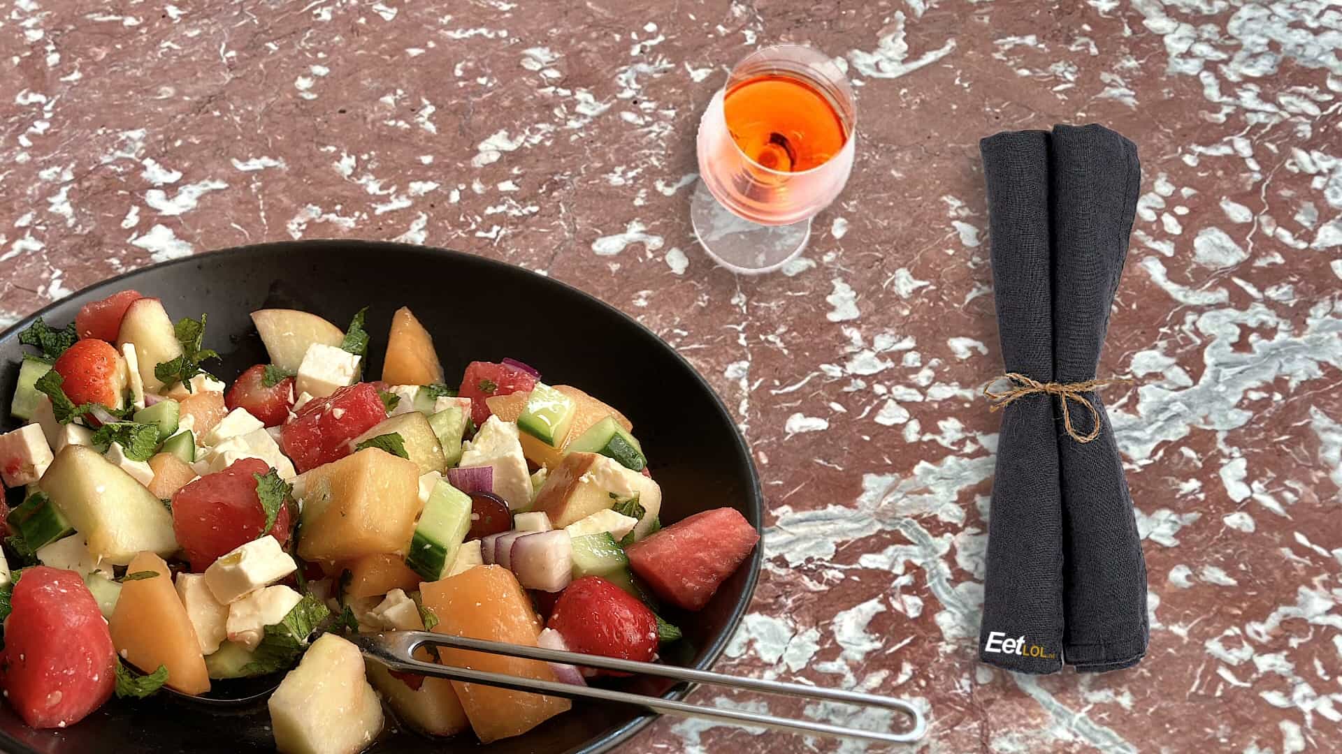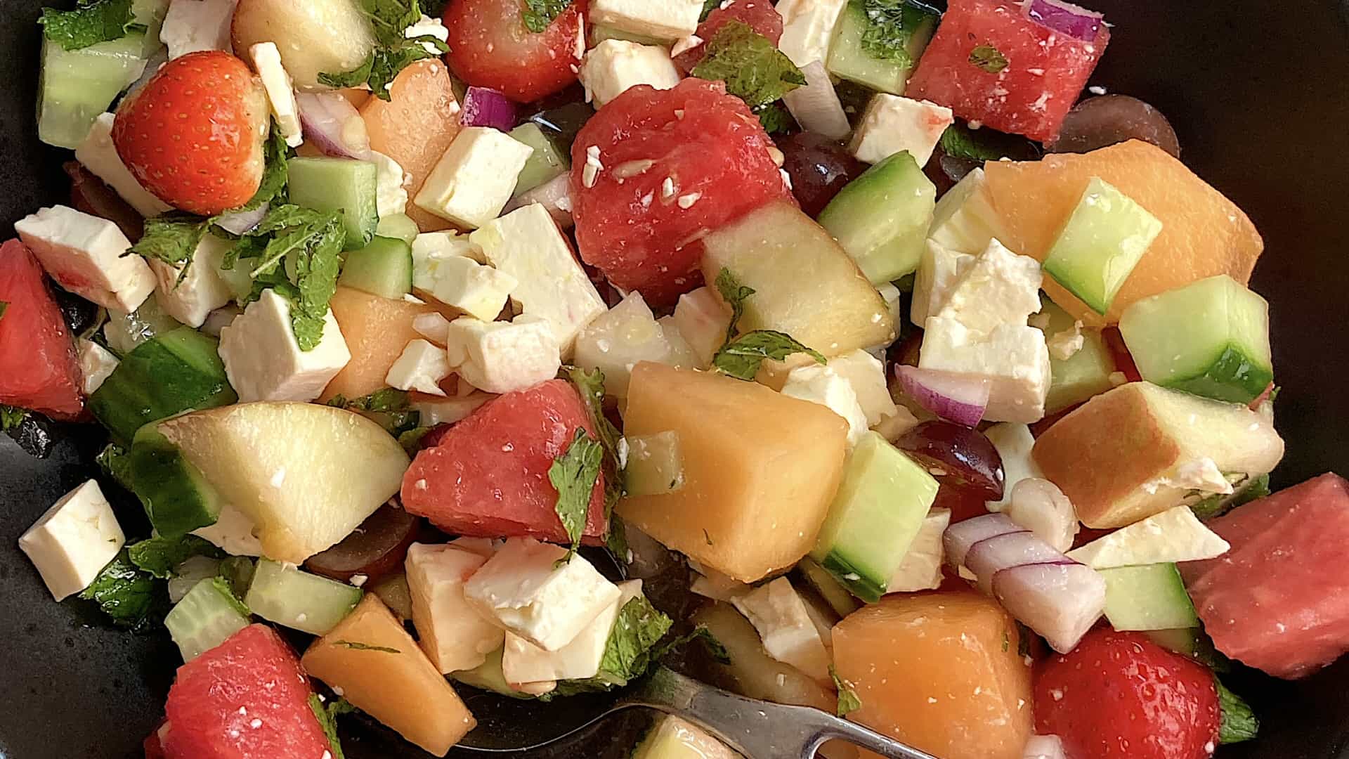 Serveer de meloensalade op een plat bord. Besprenkel met de dressing.