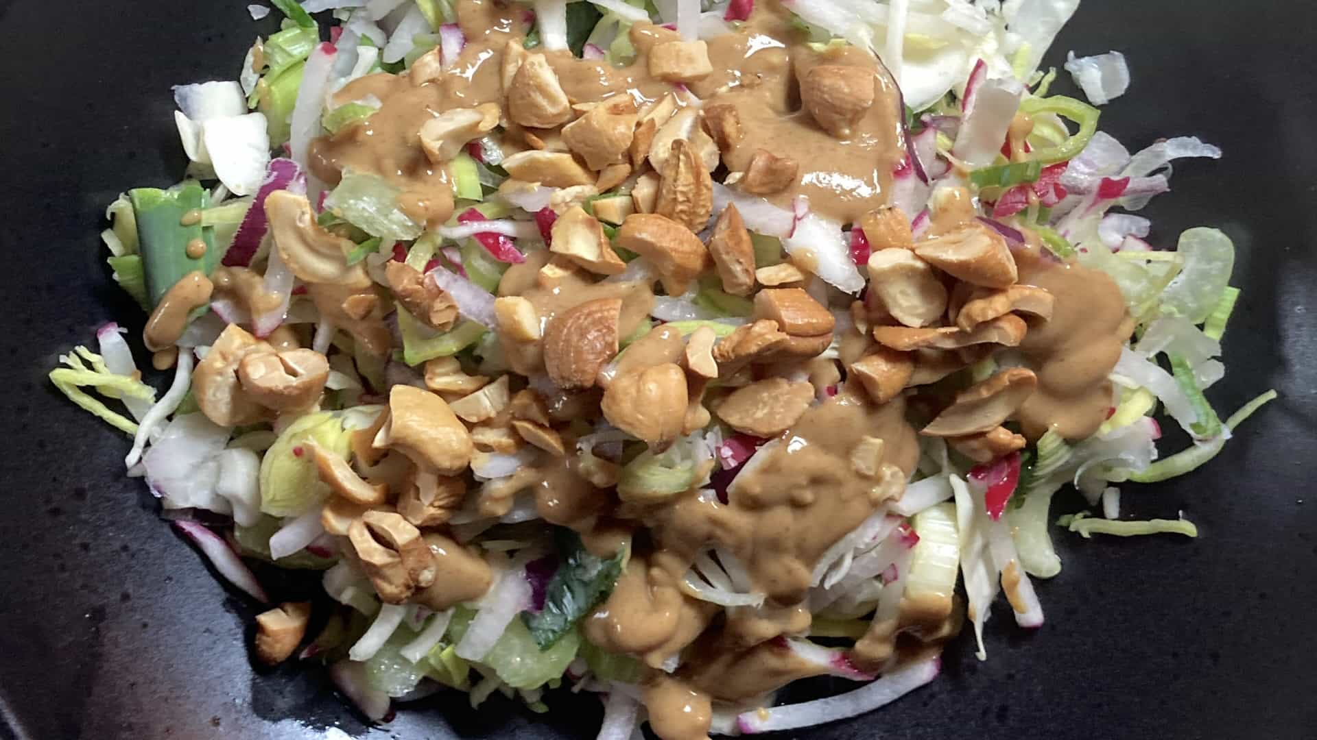 Serveer de salade op een diep bord. Druppel wat citroensap en de dressing hier overheen en strooi er wat pinda's op.