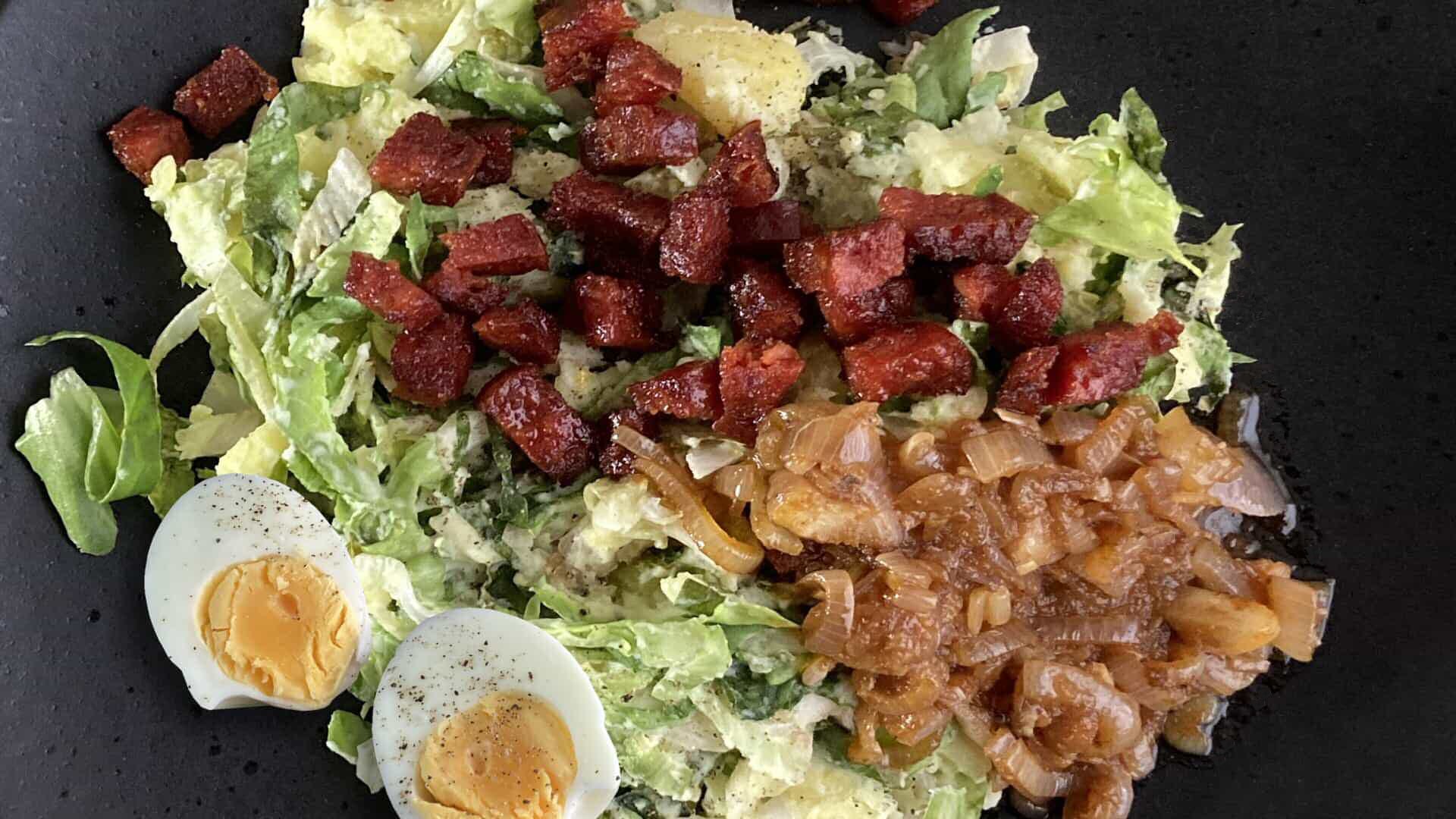 Serveer de andijviestamppot op een bord en strooi er de chorizo en uitjes overheen en decoreer met de eieren.