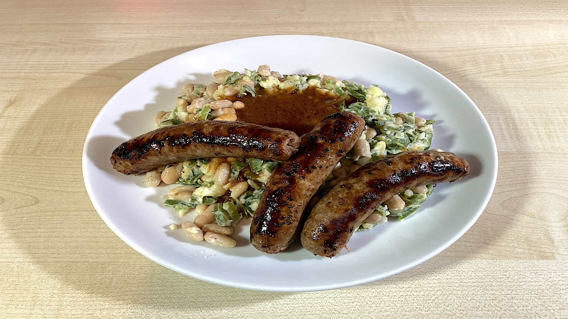 Voor de aardappelen en de snijbonen heb je een kookpan nodig. Voor de worstjes een koekenpan.