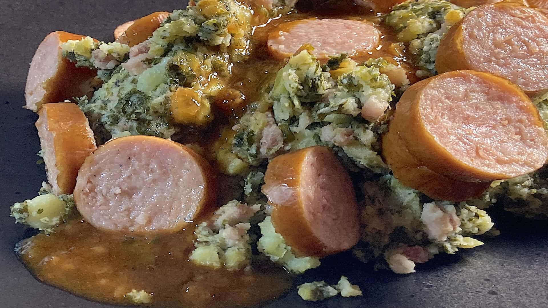 De aardappelen, boerenkool en spekreepjes gaan allemaal in één pan. De rookworst in een steelpan. Gebruik een restje jus of maak het zelf.