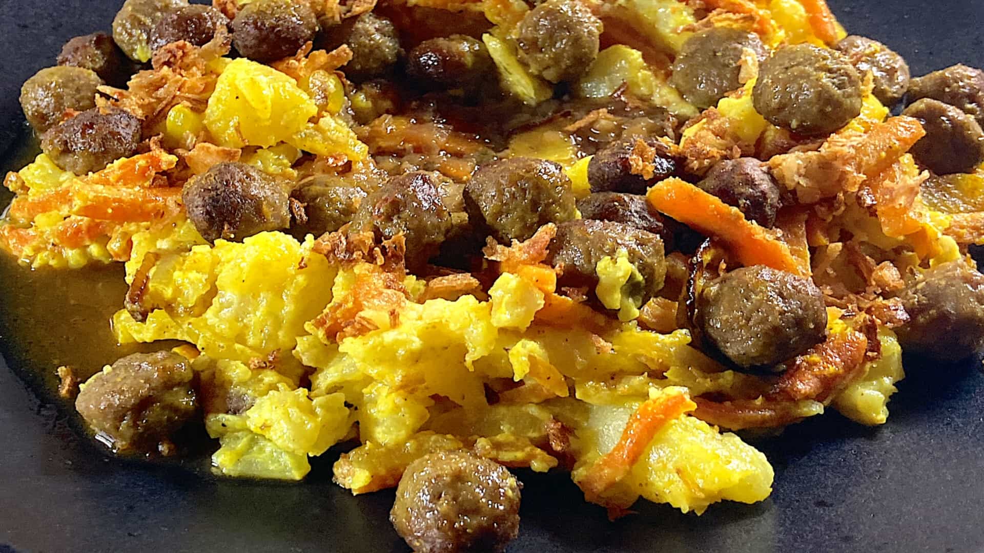 Serveer, met of zonder jus, de geroosterde hutspot op een bord met de gehaktballetjes. Strooi er de gebakken uitjes over.