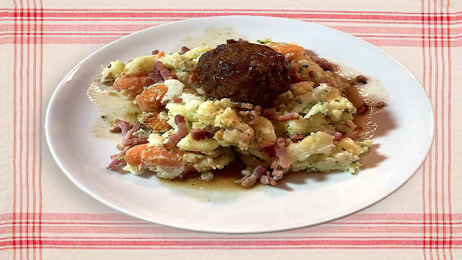 Serveer de groentestamppot op een plat bord en vergeet de jus niet.