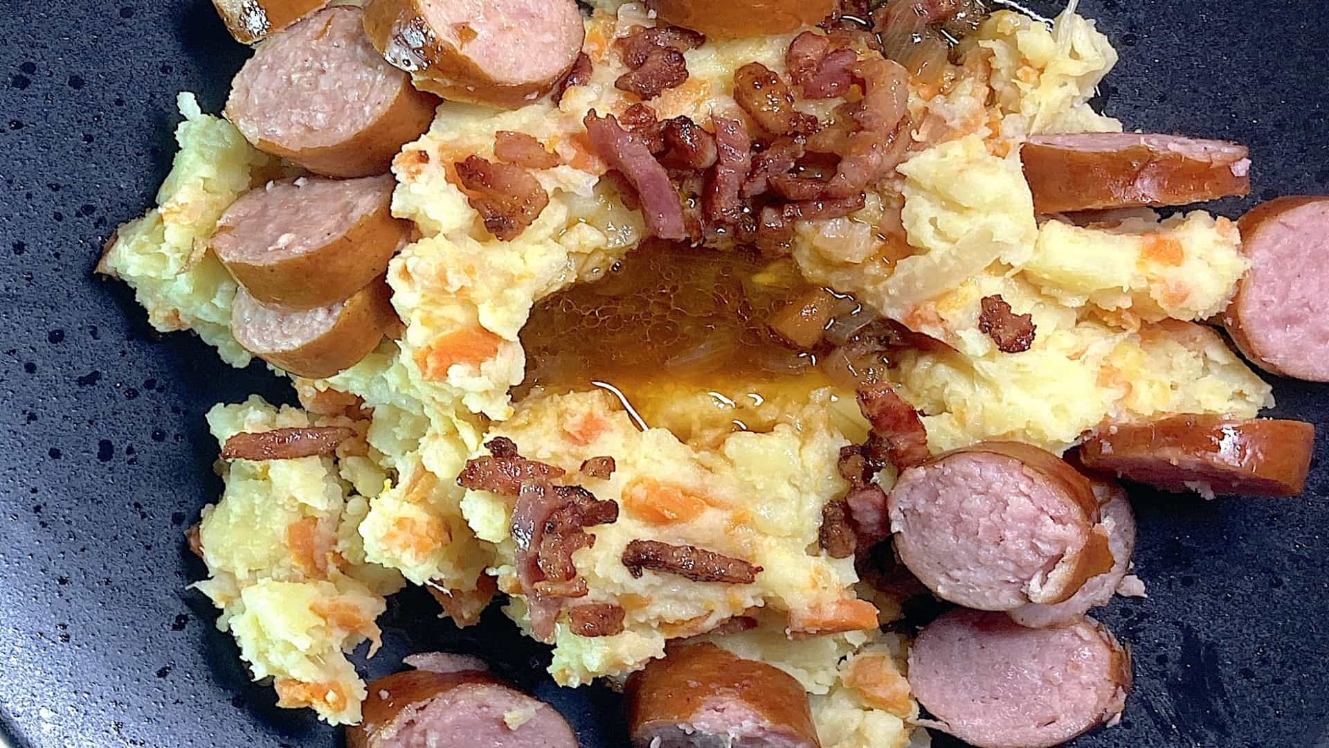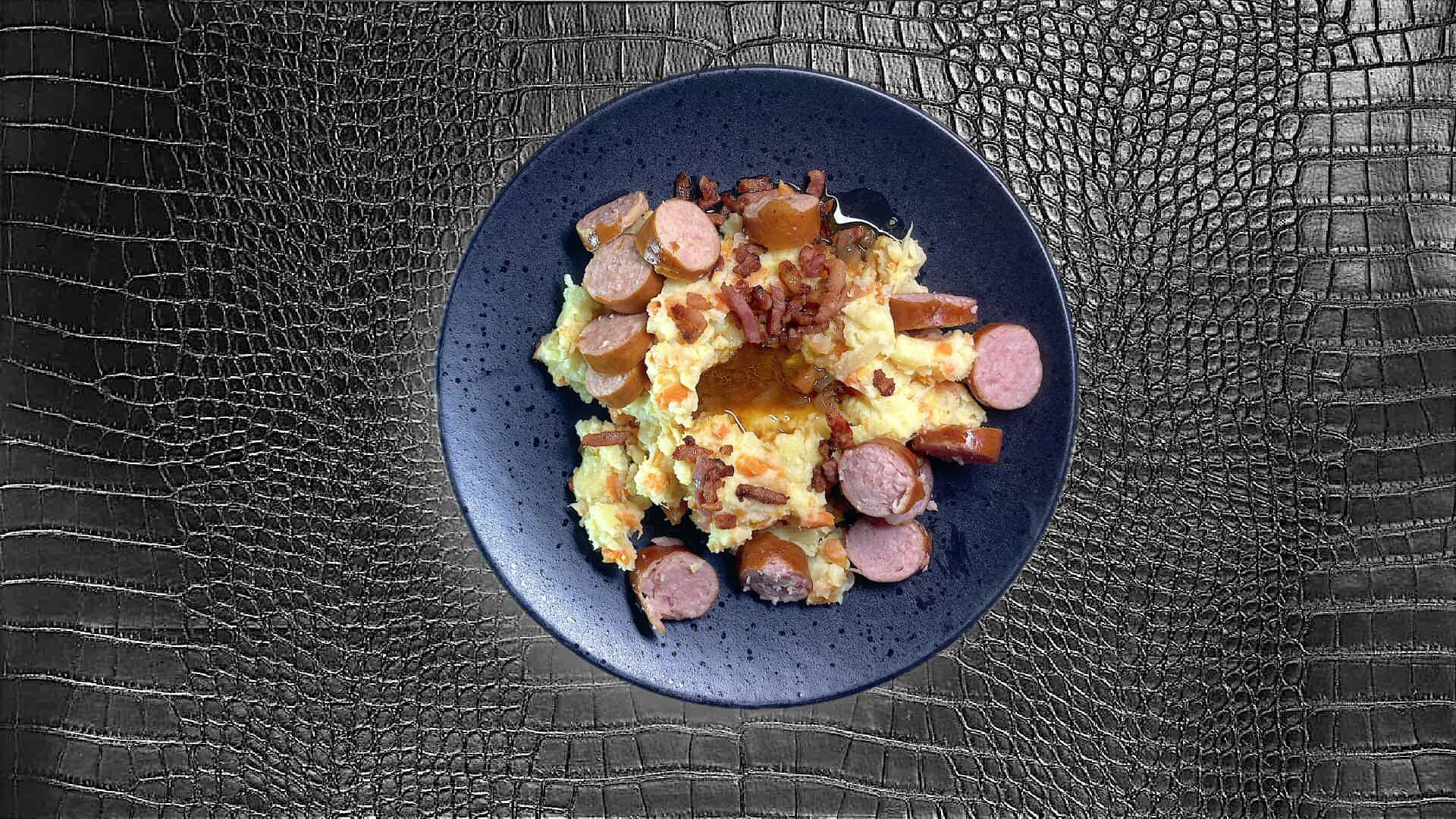 Serveer de hutspot op een plat bord en giet de jus in een kuiltje. Voeg je vleeskeuze en de spekreepjes toe.