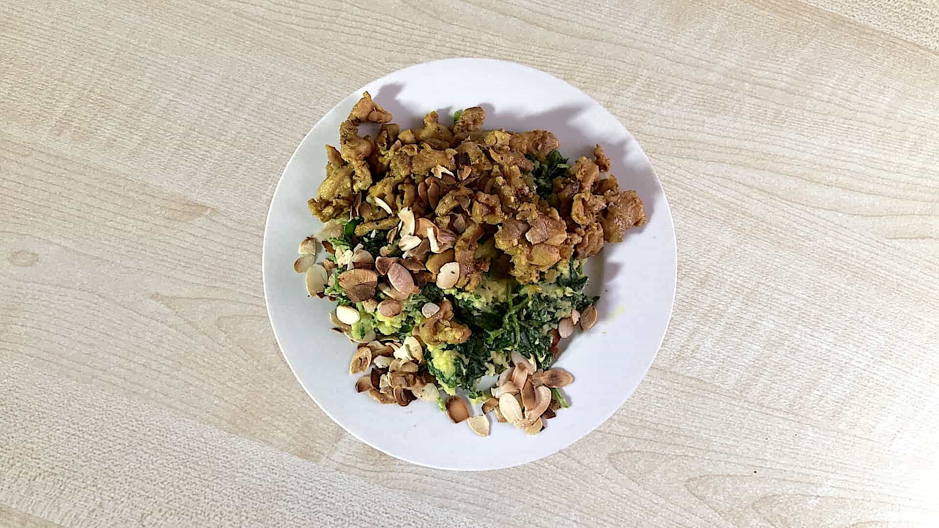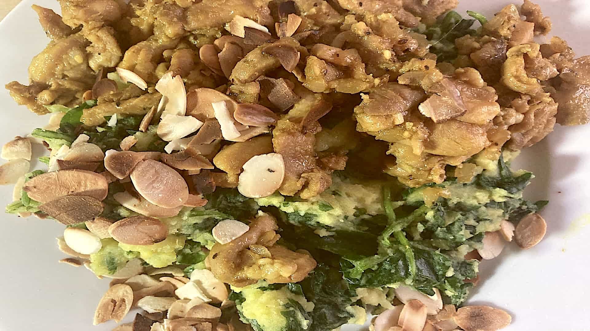 Serveer de spinaziestamppot op een plat bord en bestrooi met het geroosterde amandelschaafsel.