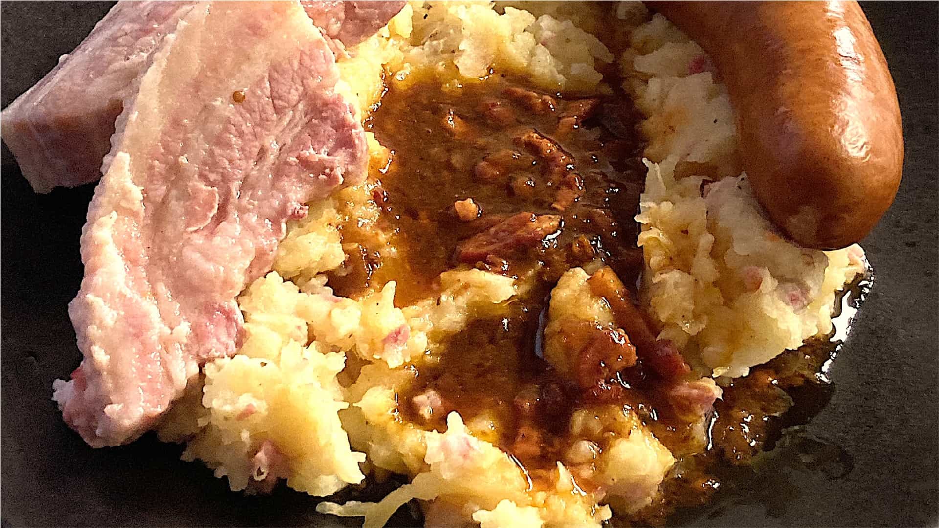De aardappelen, zuurkool en spekreepjes gaan allemaal in één pan. De rookworst in een steelpan. Gebruik een restje jus of maak het zelf.