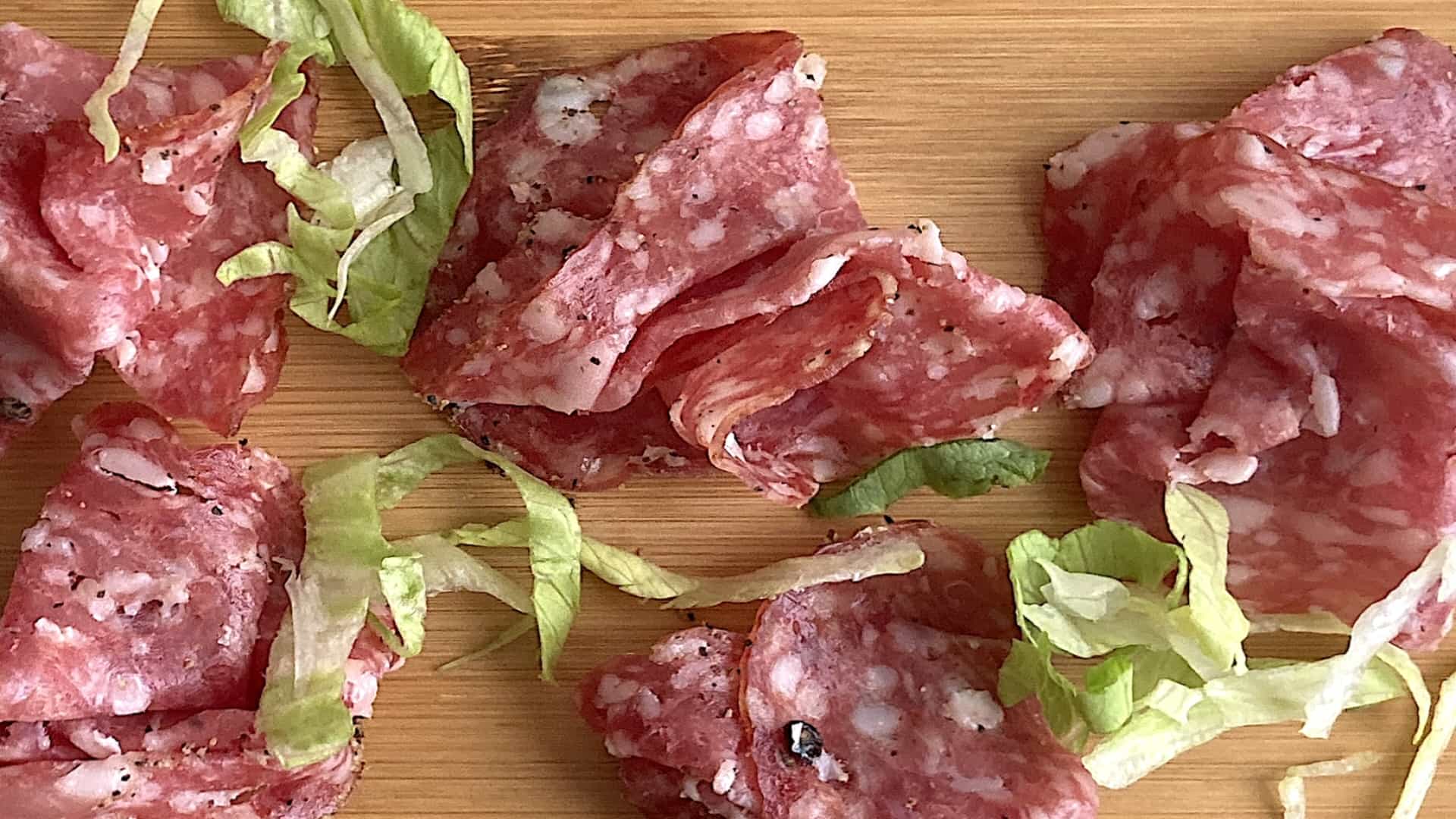 Als je geen Franse Pur Porc in plakjes kunt vinden is elke peperworst in plakjes ook goed.