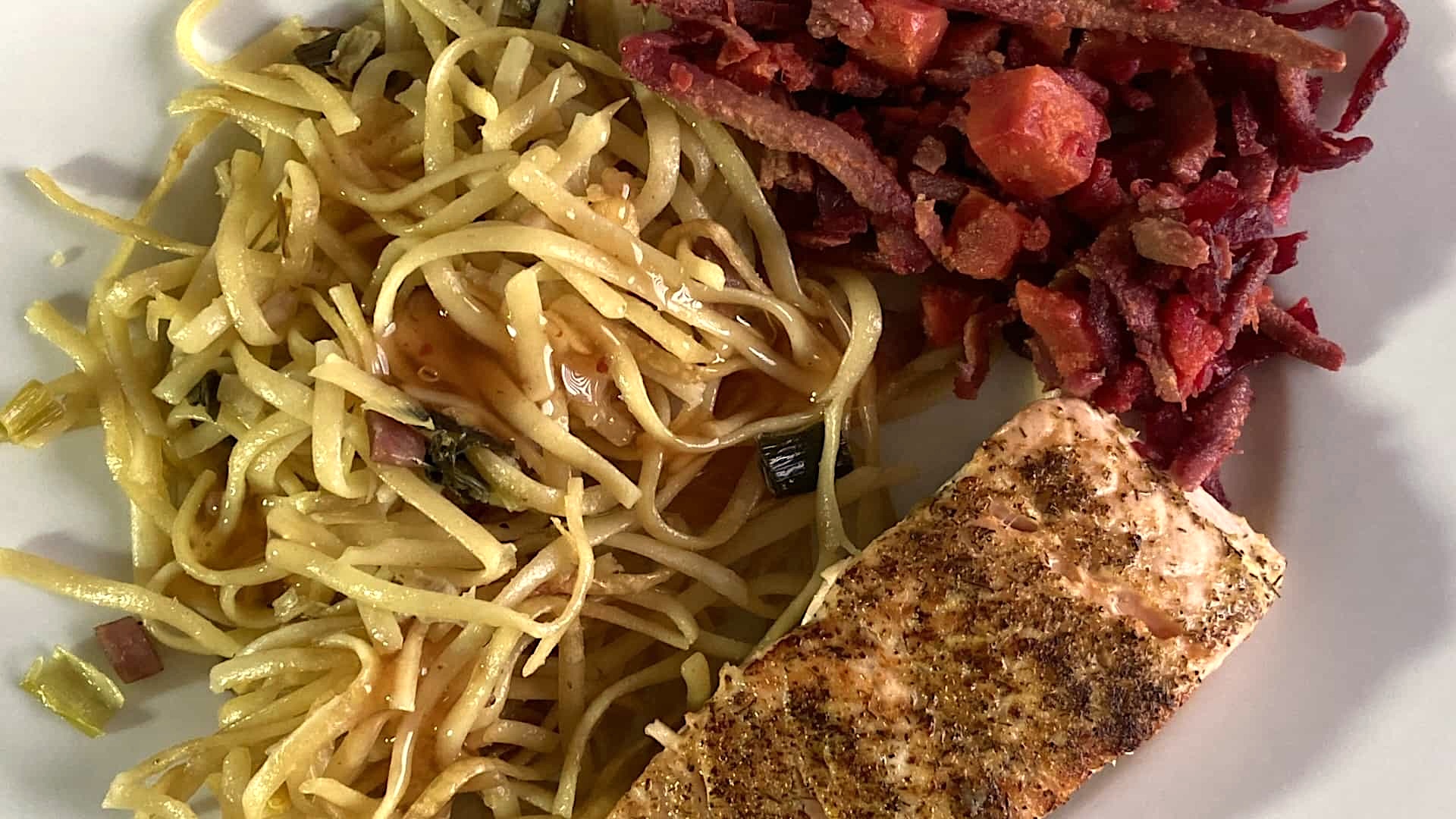 Op de foto is het gerecht afgebeeld met een restje bietensalade, maar elke andere salade kan ook.