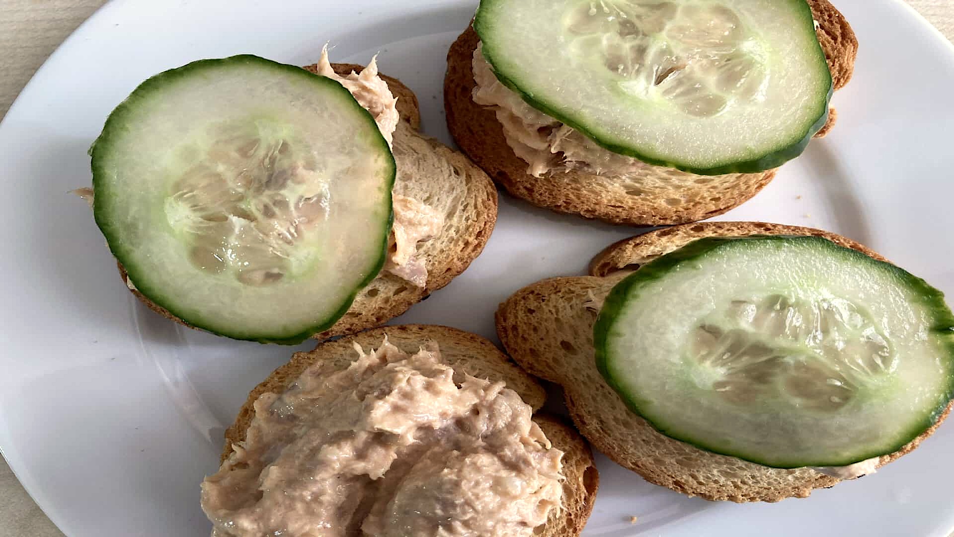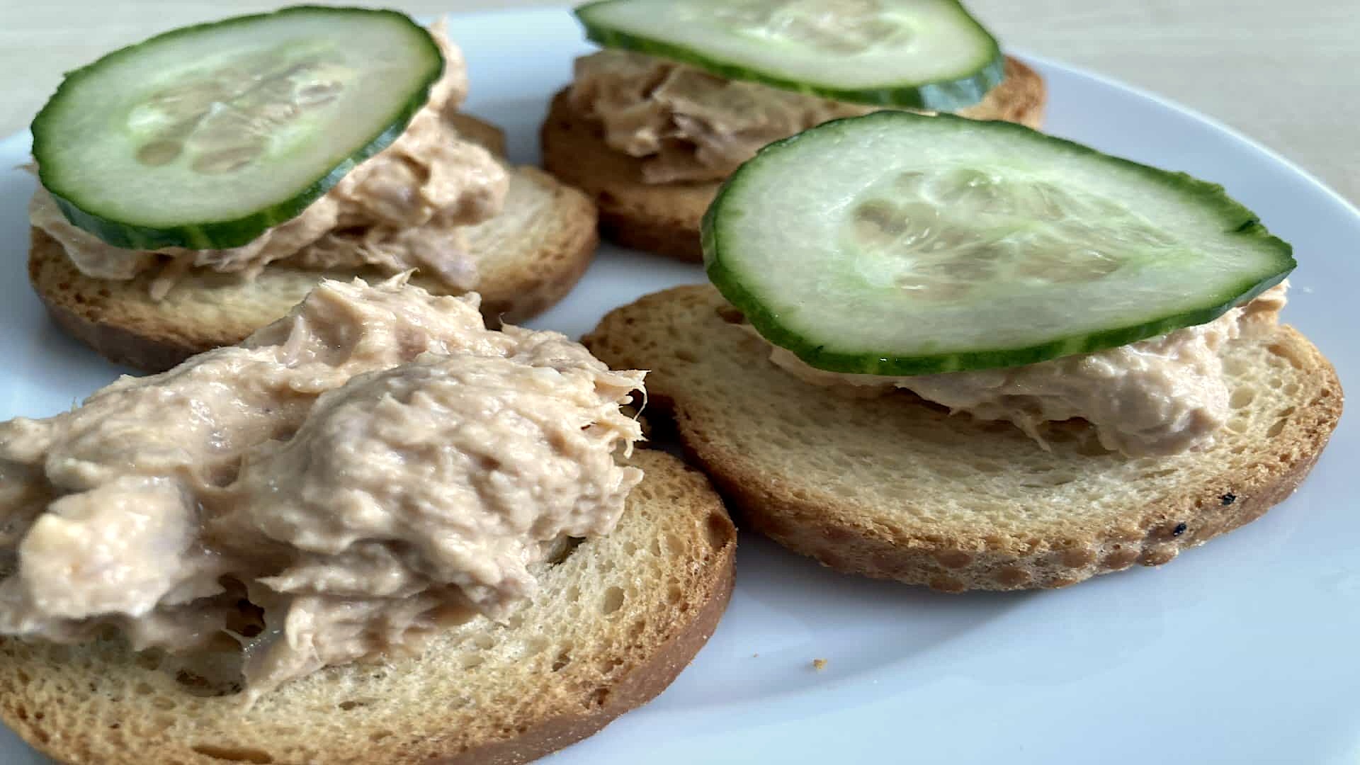 Serveer 4 toastjes per persoon op een plat bord of meerdere op een groot bord voor een groot gezelschap.
